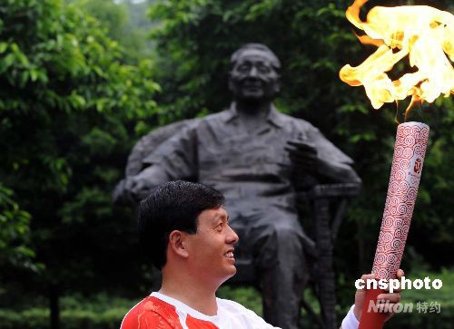 鄧小平故里牌坊村村民李良國在小平銅像前傳遞火炬。
