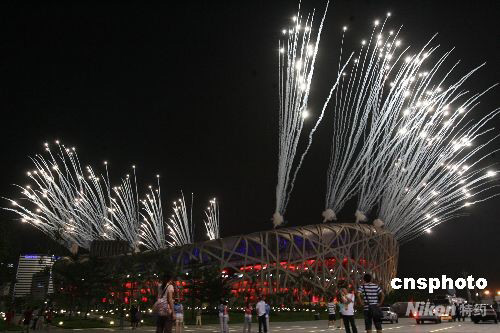 圖:奧運(yùn)會(huì)開幕式彩排 “鳥巢”上空煙花綻放