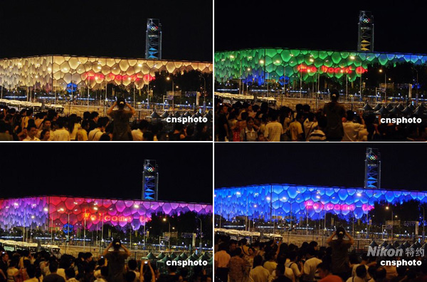 8月2日晚,國(guó)家游泳中心“水立方”亮燈,瞬間色彩變幻莫測(cè)。 中新社發(fā) 王東明 攝