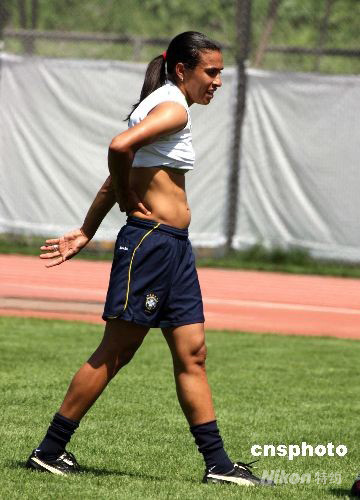8月3日,巴西女足靈魂人物、“世界足球小姐”瑪塔長衣短打扮。當(dāng)日,巴西女足隊(duì)員于炎熱的中午在沈陽奧體中心訓(xùn)練場進(jìn)行訓(xùn)練。中新社發(fā) 張宇 攝