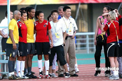8月3日下午,參加北京奧運(yùn)會(huì)足球比賽的巴西男足在沈陽(yáng)首次訓(xùn)練后,與前來(lái)準(zhǔn)備訓(xùn)練的德國(guó)女足隊(duì)員巧遇并合影留念。 中新社發(fā) 張宇 攝