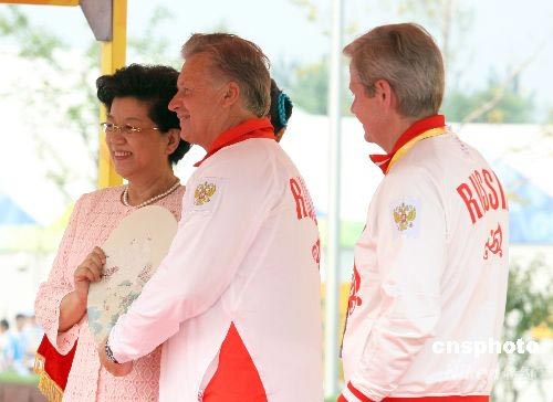 8月5日,俄羅斯奧運(yùn)代表團(tuán)在北京奧運(yùn)村舉行升旗儀式,北京奧運(yùn)村村長(zhǎng)陳至立出席了升旗儀式。中新社發(fā) 盛佳鵬 攝