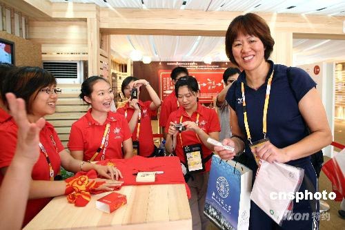 8月5日,美國(guó)女排主教練郎平在北京奧運(yùn)村紀(jì)念章交換中心內(nèi)領(lǐng)取了一件環(huán)保T恤衫和環(huán)?曜。每件T恤衫是用從5個(gè)500毫升裝的塑料可樂(lè)瓶中提取的纖維,再補(bǔ)充一些棉纖維做成的。 中新社發(fā) 盛佳鵬 攝
