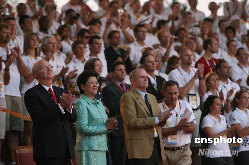 8月5日晚,參加北京奧運(yùn)會的美國代表團(tuán)在北京奧運(yùn)村舉行升旗儀式,奧運(yùn)村村長陳至立等出席。中新社發(fā) 武仲林 攝