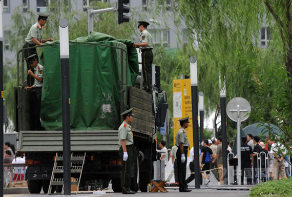 圖:武警士兵揭開車載式禮花炮遮蓋布