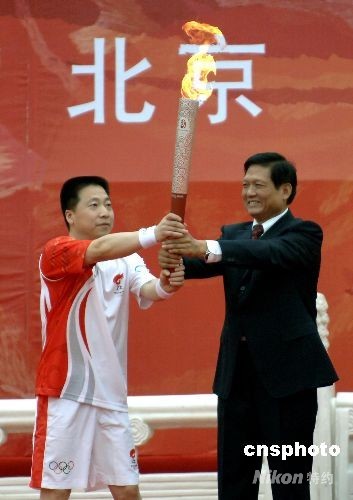 8月6日上午,北京奧運(yùn)火炬?zhèn)鬟f在午門正式開始。圖為“航天英雄”楊利偉從北京市委書記劉淇手里接過(guò)首棒火炬。中新社發(fā) 王東明 攝