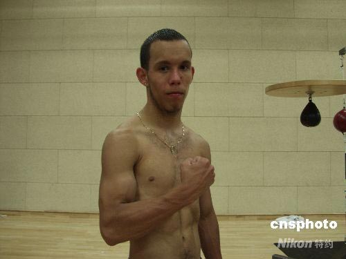 8月5日,美國拳擊隊在北京師范大學訓練營進行奧運會前的公開訓練。圖為奪金熱門拳手美國的路易斯·揚耐茲正展示自己的肌肉。他也是中國選手鄒市明奪金道路上最大的攔路虎。中新社發(fā) 賴松 攝