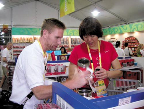 昨晚7點(diǎn)半,采訪完奧運(yùn)村美國(guó)代表團(tuán)的升旗儀式,順路去奧運(yùn)特許商品指定專賣店看看。一進(jìn)門,就發(fā)現(xiàn)自己來(lái)對(duì)了——林丹、謝杏芳這對(duì)“中國(guó)體壇情侶”正在輕聲細(xì)語(yǔ)地一道逛商店呢。再一看,中國(guó)男排穿著統(tǒng)一的藍(lán)白橫紋T恤,都跟著“老大”周建安在店里轉(zhuǎn)悠。過(guò)了一會(huì)兒,美國(guó)女排教練郎平也來(lái)了……