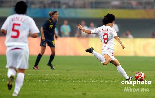 北京奧運(yùn)會(huì)女足小組賽首輪比賽今晚全面打響,中國(guó)女足19時(shí)45分在天津奧林匹克球場(chǎng)迎戰(zhàn)瑞典隊(duì)。最終經(jīng)過(guò)90分鐘鏖戰(zhàn),中國(guó)女足憑借徐媛和韓端的進(jìn)球,以2-1擊敗對(duì)手,迎來(lái)開(kāi)門紅。中新社發(fā) 陳文 攝