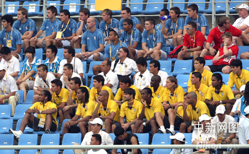 8月6日,北京奧運(yùn)會(huì)沈陽足球分賽場(chǎng)女足預(yù)賽,巴西對(duì)德國0:0戰(zhàn)平。圖為巴西男足隊(duì)員觀看比賽。 中新社記者 張宇 攝