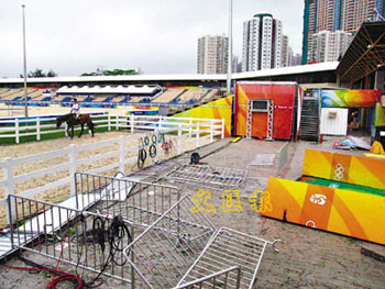 臺風“北冕”把香港奧運馬術(shù)沙田主場地旁的記者區(qū)裝飾物,吹得東倒西歪。(圖片來源:文匯報)