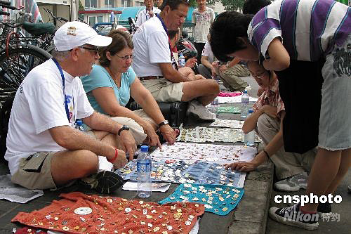 八月七日,在北京國(guó)際新聞中心附近,幾名外國(guó)游客擺起了約五米長(zhǎng)的地?cái)們,與中外游客交換奧運(yùn)徽章。 中新社發(fā) 杜燕 攝