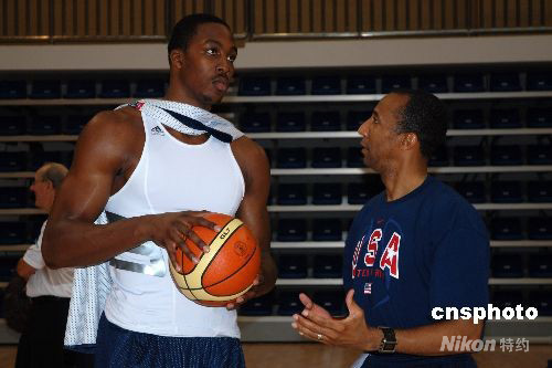 8月7日中午,美國男籃“夢(mèng)八隊(duì)”開始了抵京后的首次訓(xùn)練。圖為“魔獸”中鋒霍華德與發(fā)球教練進(jìn)行交流。中新社發(fā) 賴松 攝