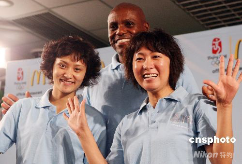 8月7日,在北京奧林匹克公園舉行了傳統(tǒng)的“巨無霸制作大賽”,并為比賽的優(yōu)勝者頒發(fā)“獎牌”。美國9枚奧運短跑金牌得主卡爾·劉易斯、中國奧運冠軍王軍霞、高敏,與麥當勞全球奧運團隊成員等一起,共同參加了巨無霸漢堡制作大賽。圖為王軍霞(右一)、高敏(左一)與卡爾·劉易斯出席“麥當勞巨無霸制作大賽”。 中新社發(fā) 錢興強 攝