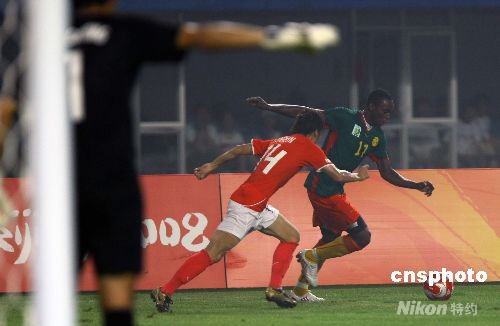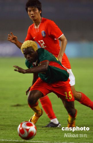 圖為韓國隊(duì)14號(hào)柏志勛與喀麥隆隊(duì)17號(hào)阿蘭·奧萊在比賽中爭搶。