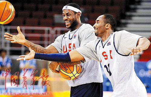 8月7日,科比(右)和詹姆斯在訓(xùn)練中搶球。當(dāng)日,美國(guó)男籃在五棵松奧運(yùn)籃球館備戰(zhàn)8月10日與中國(guó)隊(duì)的比賽。 劉占坤攝
