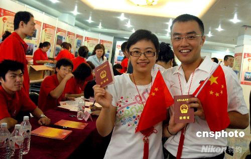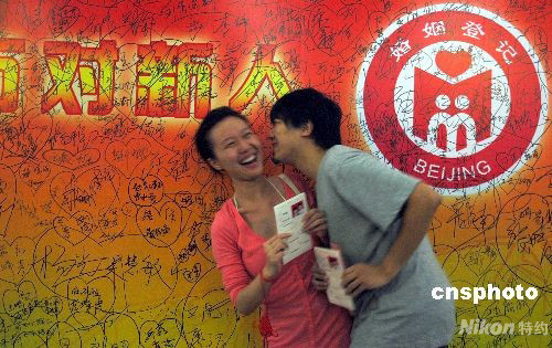 北京市西城區(qū)結婚登記處迎來了一個結婚高峰日,千余新人前來領取結婚證書。圖為一對新人領到結婚證后高興合影共慶奧運。中新社發(fā) 張雙雙 攝