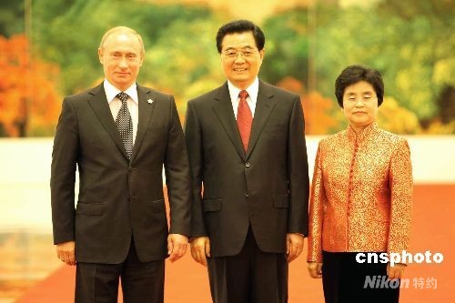 8月8日中午,中國國家主席胡錦濤和夫人劉永清在北京人民大會(huì)堂為出席北京奧運(yùn)會(huì)的貴賓舉行歡迎宴會(huì)。圖為胡錦濤夫婦歡迎俄羅斯總理普京。中新社發(fā) 任海霞 攝