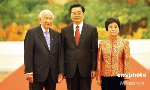 8月8日中午,中國國家主席胡錦濤和夫人劉永清在北京人民大會(huì)堂為出席北京奧運(yùn)會(huì)的貴賓舉行歡迎宴會(huì)。圖為胡錦濤夫婦歡迎國際奧委會(huì)名譽(yù)主席薩馬蘭奇。中新社發(fā) 任海霞 攝