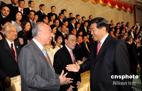 8月8日,中共中央政治局常委、全國政協(xié)主席賈慶林在北京釣魚臺(tái)國賓館會(huì)見出席北京奧運(yùn)開幕式的近200位華人華僑代表。中新社發(fā) 廖攀 攝
