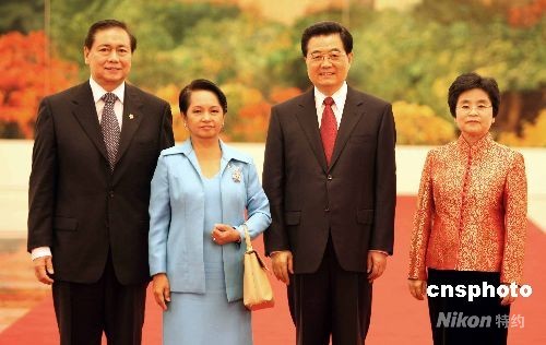 圖:胡錦濤夫婦歡迎菲律賓總統(tǒng)阿羅約夫婦