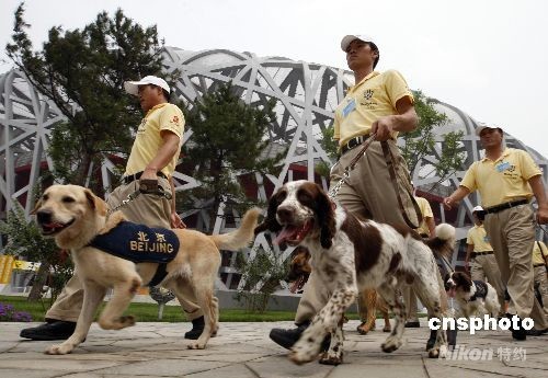 8月8日,第29屆夏季奧運(yùn)會將于當(dāng)晚在北京奧林匹克公園內(nèi)的國家體育場開幕,為保證開幕式的順利進(jìn)行,“鳥巢”周邊安保措施升級。圖為搜爆犬在“鳥巢”周邊搜爆。