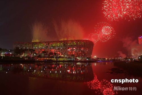 8月8日,第29屆夏季奧運(yùn)會(huì)在北京國(guó)家體育場(chǎng)開(kāi)幕,絢麗的煙火映紅北京的夜空。中新社發(fā) 武仲林 攝
