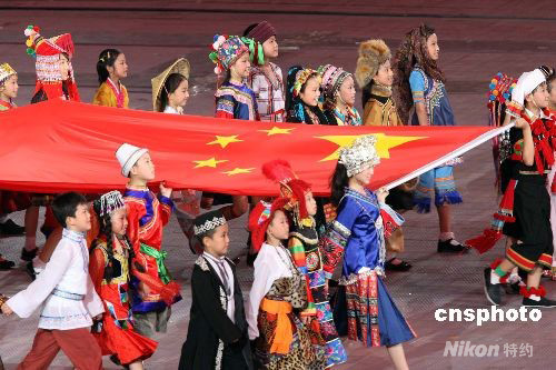 第二十九屆夏季奧運會8月8日晚在北京奧林匹克公園內(nèi)的國家體育場舉行開幕式,中國各民族兒童簇?fù)碇r艷的中國國旗入場。 中新社發(fā) 任晨鳴 攝