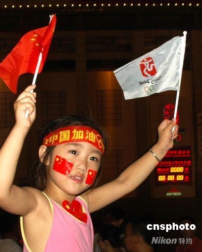 8月8日晚8時,北京天安門廣場東側(cè)奧運倒計時牌歸零。在天安門廣場為北京奧運狂歡的一位小女孩拿著中國國旗為北京奧運加油。中新社發(fā) 張雙雙 攝