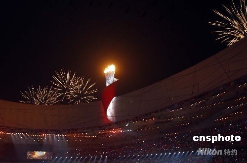 8月8日,第29屆夏季奧運(yùn)會(huì)在北京奧林匹克公園內(nèi)的國家體育場“鳥巢”舉行。李寧點(diǎn)燃北京奧運(yùn)會(huì)主火炬,奧運(yùn)圣火在鳥巢上空熊熊燃燒。中新社發(fā) 杜洋 攝