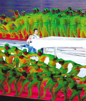 演出下篇開始,只見郎朗坐在一片藍色的海洋中,身邊坐著一個天真稚氣的小女孩兒,圍繞在他周圍的是無數(shù)穿著高科技發(fā)光服的“綠”人,郎朗面帶微笑,一臉輕松和愉悅,音符從十指間滑出,周圍的場景隨之不斷發(fā)生著奇妙變化,藍色的海洋開始呈現(xiàn)出中國現(xiàn)代化建設(shè)成就,青藏鐵路也出現(xiàn)在郎朗的腳下。而“綠”人身上的光也隨之變化為銀色,變換出和平鴿、銀河等造型,最后濃縮為一座微型的鳥巢,郎朗在“巢中巢”歡快地彈奏,一個小女孩飛進巢中巢,乘著風(fēng)箏飛到他面前,充滿詩意。整個節(jié)目長達8分鐘,成為本屆開幕式上分量最重的個人演出。在演出結(jié)束的第一時間,通過萬寶龍公司的幫助,本報對郎朗進行了專訪。
