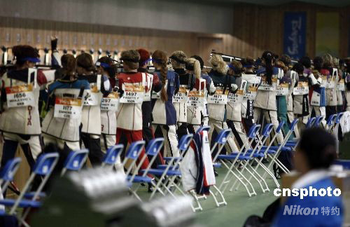 8月9日,北京奧運會開賽的第一天,女子10米氣步槍資格賽率先在北京射擊館拉開戰(zhàn)幕。30多個國家的47名選手在17到63號靶位比試槍法,資格賽前8名進入最后決賽。按照賽程,女子氣步槍賽場極可能產(chǎn)生本屆奧運會的首枚金牌。圖為來自各國的女神槍手參加預賽。中新社發(fā) 盛佳鵬 攝