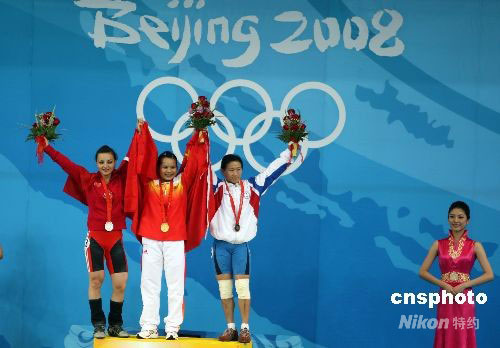 8月9日上午,中國(guó)舉重選手陳?ài)葡荚诒本⿰W運(yùn)會(huì)女子舉重48公斤級(jí)決賽中以總成績(jī)212公斤打破奧運(yùn)會(huì)記錄,力壓各路群芳獲得冠軍,土耳其選手西貝爾·厄茲坎(OZKAN Sibel)獲得銀牌,中華臺(tái)北選手陳葦綾(右)獲得銅牌。中新社發(fā) 任晨鳴 攝