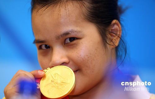 8月9日上午,中國舉重選手陳燮霞在北京奧運會女子舉重48公斤級決賽中氣勢如虹,以總成績212公斤打破奧運會記錄,力壓各路群芳獲得冠軍,為中國軍團斬獲本屆奧運會的第一枚金牌。中新社發(fā) 任晨鳴 攝