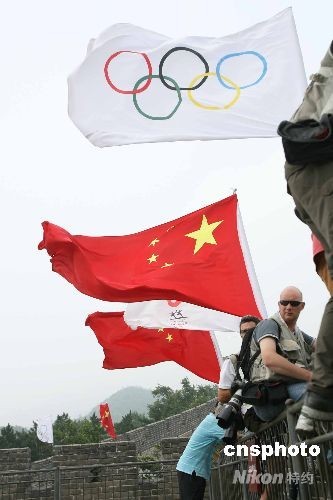 圖為奧運(yùn)旗幟在長城上高高飄揚(yáng)。中新社發(fā) 武仲林 攝
