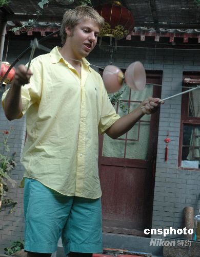 奧運(yùn)會(huì)期間,北京將迎來四十五萬中外游客。圖為8月9日下午一美國(guó)青少年游覽北京金絲胡同的一座四合院時(shí),學(xué)主人玩起了抖空竹游戲。 中新社發(fā) 王辛莉 攝