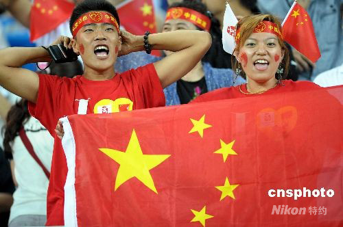 8月9日晚,中國女足在天津奧體中心水滴體育場與加拿大女足進行奧運第二場小組賽的較量,球迷在比賽現場為奧運會女足比賽加油。 中新社發(fā) 陳文 攝