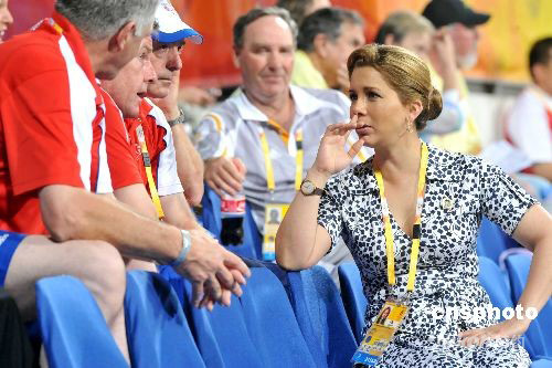 八月九日晚,北京奧運(yùn)馬術(shù)項(xiàng)目在香港沙田賽場(chǎng)舉行盛裝舞步賽事,國(guó)際馬術(shù)聯(lián)合會(huì)主席、約旦公主哈雅到場(chǎng)觀賽,并與參賽隊(duì)伍職員在看臺(tái)上交談。中新社發(fā) 鄧慶樂 攝