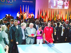 在當(dāng)天的奧運(yùn)法語(yǔ)大家庭聚會(huì)中,場(chǎng)地中央設(shè)置了一個(gè)乒乓球臺(tái),而身著一身火紅色球衣的前比利時(shí)乒壇名將米歇爾·塞弗和中國(guó)乒乓球名將王濤、陳龍燦和江嘉良等數(shù)位乒乓球冠軍都成了當(dāng)天的“擂主”。來(lái)自法語(yǔ)國(guó)家組織的領(lǐng)導(dǎo)人紛紛拿起球拍“打擂”,體驗(yàn)“小球的藝術(shù)”。
