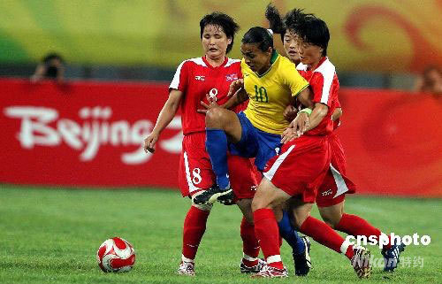 8月9日,北京奧運會沈陽分賽場舉行女足預(yù)賽,巴西隊2:1勝朝鮮隊。比賽中,巴西隊瑪塔被朝鮮隊嚴(yán)防。中新社發(fā) 張宇 攝
