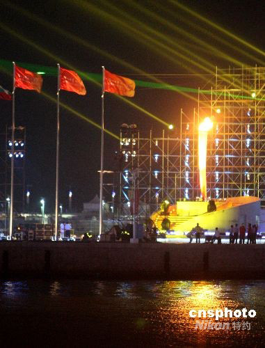 第29屆奧林匹運動會帆船比賽啟動儀式8月9日晚在青島舉行,由香港退役運動員李麗珊點燃的火炬在奧帆中心熊熊燃燒,成為青島一景。中新社發(fā) 趙振清 攝