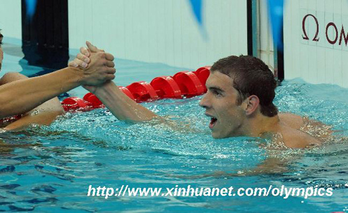 8月10日,美國(guó)選手菲爾普斯(右)賽后接受祝賀,他在男子400米個(gè)人混合泳決賽中,以4分03秒84的成績(jī)獲得冠軍,并打破世界紀(jì)錄。這是北京奧運(yùn)會(huì)首枚游泳比賽金牌。 新華社記者陳凱攝