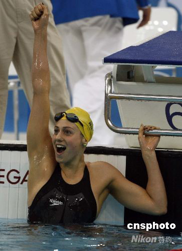 8月10日,北京奧運會女子400米個人混合泳決賽中,澳大利亞選手賴斯打破世界紀錄并獲得冠軍。賴斯創(chuàng)造的新世界紀錄為4分29秒45。原世界紀錄是美國選手霍夫在今年6月底創(chuàng)造的4分31秒12。 中新社發(fā) 杜洋 攝