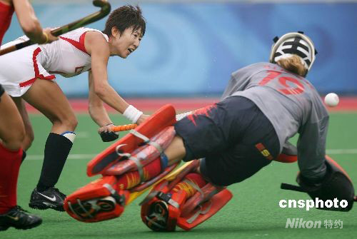 8月10日,中國女曲在奧運會女子曲棍球小組賽首場比賽中以3:0戰(zhàn)勝西班牙隊。圖為中國隊在進攻中。 中新社發(fā) 武仲林 攝