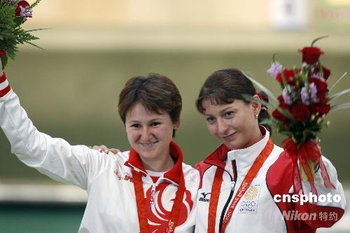 8月10日,北京奧運會女子10米氣手槍決賽在北京射擊館落下帷幕,中國選手郭文珺以492.3環(huán)勇奪金牌,俄羅斯選手納塔利婭·帕杰林娜總分489.1環(huán)位列第二獲得銀牌,格魯吉亞老將妮諾·薩盧克瓦澤以487.4環(huán)的成績奪得銅牌。 圖為帕杰林娜(左)與薩盧克瓦澤在領(lǐng)獎臺上親密合影。 中新社發(fā) 盛佳鵬 攝