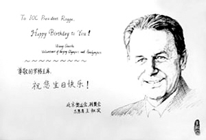 王秋實(shí)是北京航空航天大學(xué)的大四女生,今年4月份被選為首都機(jī)場(chǎng)奧運(yùn)志愿者,由于有著深厚的繪畫(huà)功底,她代表所有志愿者為羅格送上了一張肖像素描的生日卡。這張生日卡是在羅格生日前,由北京奧組委志愿者部轉(zhuǎn)交給羅格的。 沒(méi)想到一張小小的卡片,卻得到了羅格的回應(yīng)。羅格先生在信中對(duì)王秋實(shí)表示感謝。