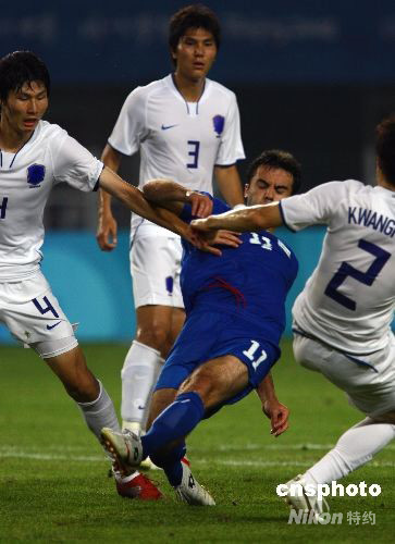 8月10日,北京奧運(yùn)男足預(yù)賽,意大利對(duì)韓國(guó)的比賽在秦皇島奧體中心舉行,上半場(chǎng)意大利2:0領(lǐng)先韓國(guó)隊(duì)。圖為意大利隊(duì)11號(hào)朱塞佩·羅西首先攻破韓國(guó)大門。 中新社發(fā) 劉新 攝