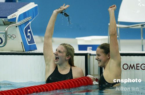8月11日,北京奧運(yùn)會女子400米自由泳,英國選手麗貝卡 ·阿德林頓以4分3秒22的成績獲得冠軍(左),隊(duì)友喬安妮·杰克遜(右)以4分3秒52獲得銅牌。中新社發(fā) 杜洋 攝