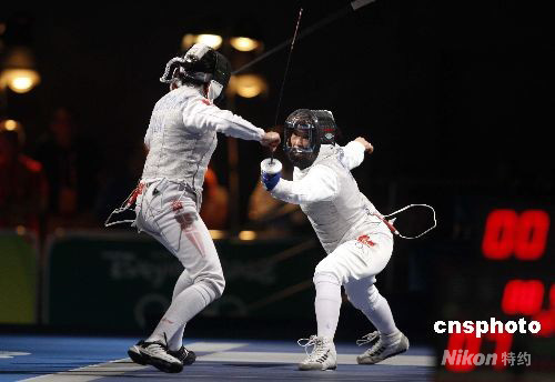 8月11日,北京奧運會女子花劍個人1/32決賽在北京國家會議中心擊劍館舉行,代表加拿大出戰(zhàn)的“擊劍媽媽”欒菊杰(右)以13:9的成績戰(zhàn)勝突尼斯選手伊娜·布貝克里,成功晉級。 中新社發(fā) 盛佳鵬 攝