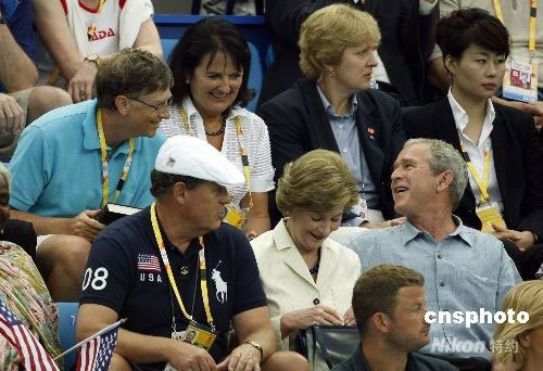 8月11日,美國總統(tǒng)布什和比爾·蓋茨在“水立方”相遇,一同觀看游泳比賽,為美國隊加油助威。中新社發(fā) 杜洋 攝